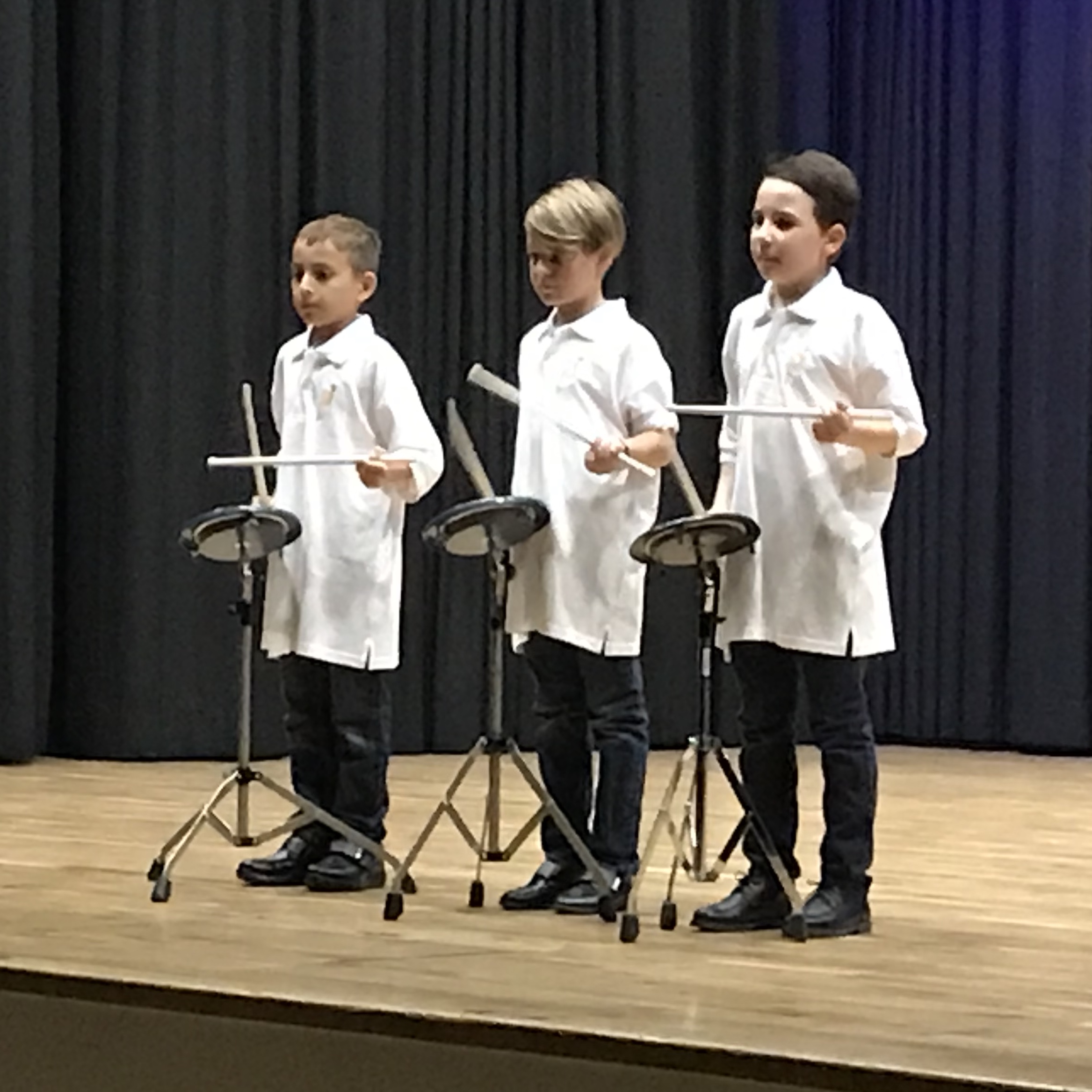 Das Trio der jüngsten Anfängergruppe 1 trommelte unter der Leitung von Fabian Branger auf dem Übungsböckli «Basics». Auch Livio Niedermanns Anfängergruppe 2 begeisterte das Publikum auf dem Böckli mit «Ratatui» sowie mit der sehr körperbetonten Eigenkomposition «Gulugluu».